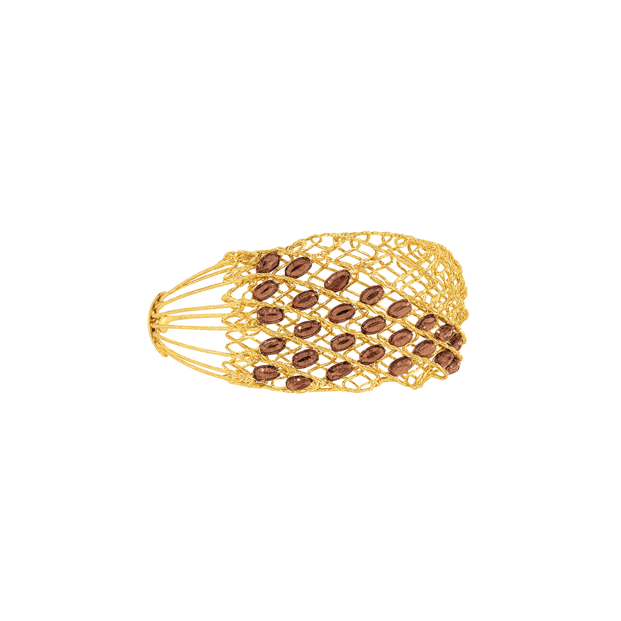 A sculptural statement piece, this 18K gold soft bangle features a woven lacework structure with rich brown bead accents. Lightweight yet bold, it’s a celebration of artful craftsmanship.