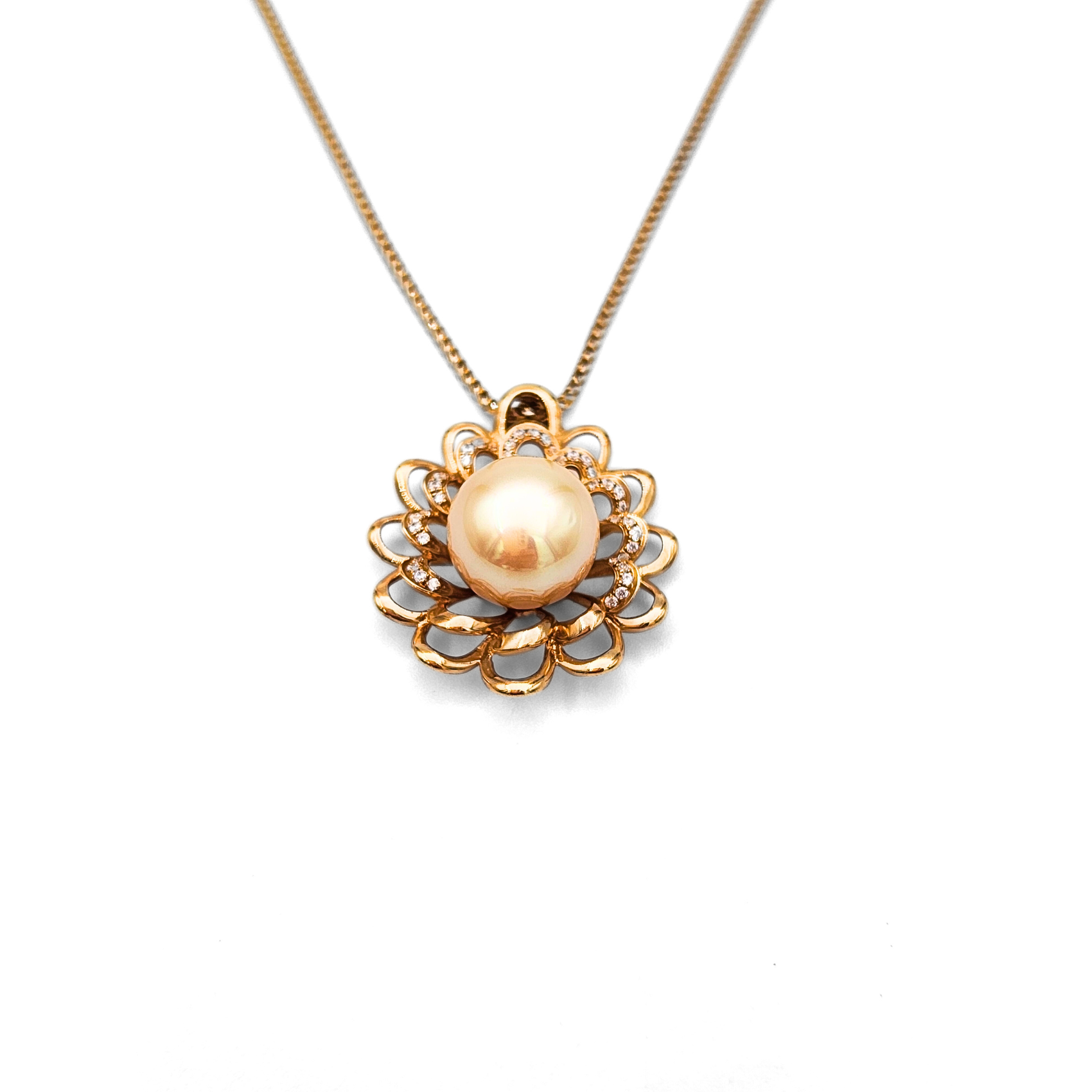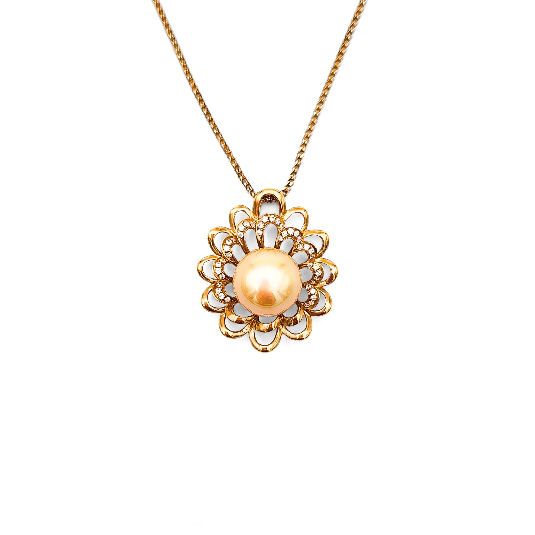 这款绝美的饰品以一颗光彩夺目的南海金珍珠为特色,珍珠优雅地镶嵌在精致的花形设计中心。花瓣上点缀着细腻的钻石装饰,增添了一丝闪耀光芒,提升了整体的奢华感。吊坠悬挂在一条精美的18K金链上,展示出卓越的工艺和细节的完美结合。